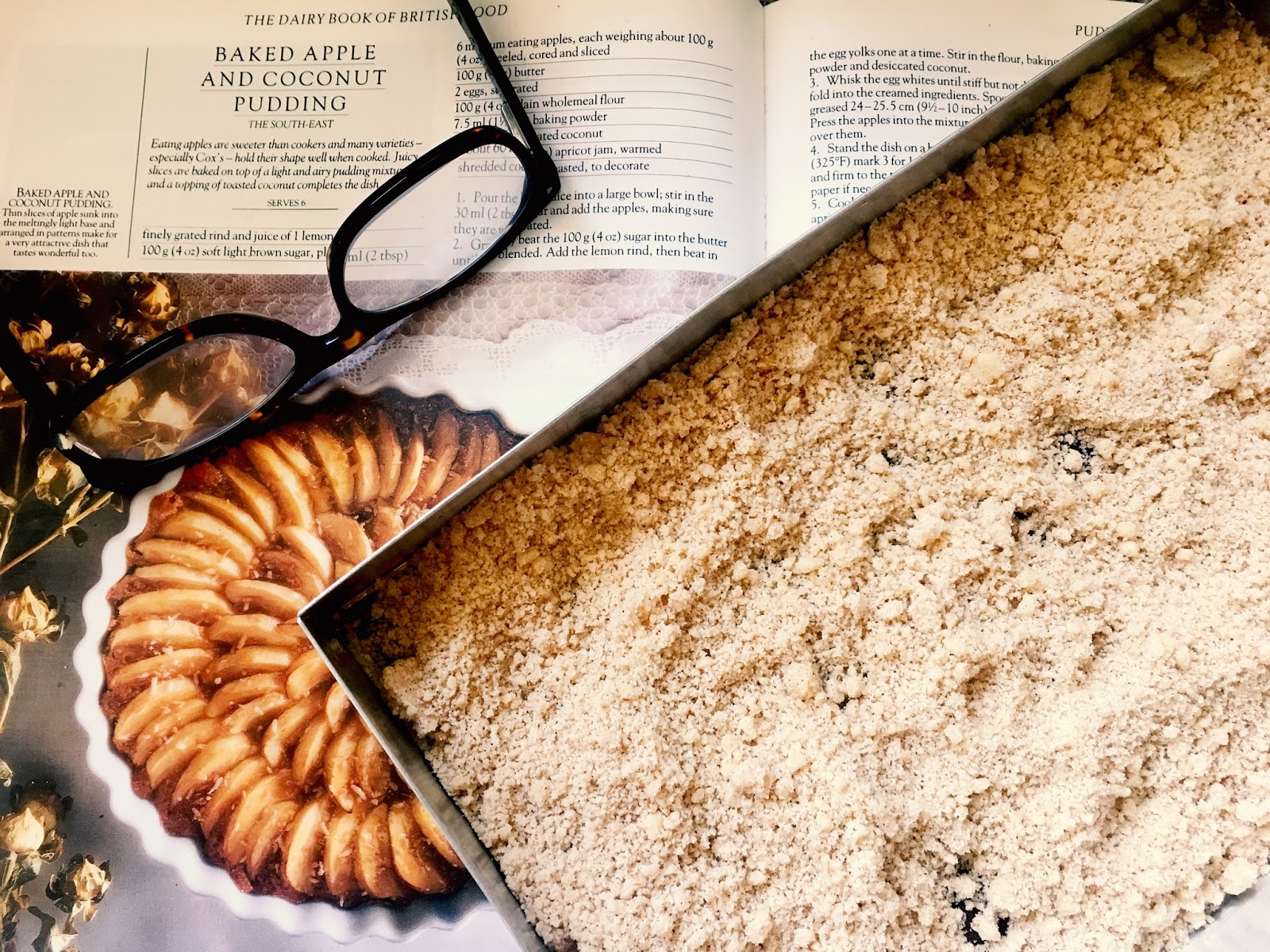Añadimos el azúcar glas y la canela, terminamos de integrar sin que la masa del crumble pierda ese aspecto de migas y disponemos sobre una bandeja de horno forrada con papel de hornear o teflón a 180º unos 20-30 minutos, o hasta que lo veamos doradito. De vez en cuando es conveniente abrir con cuidado el horno y mover un poco el crumble para que no se apelmace y quede suelto.
