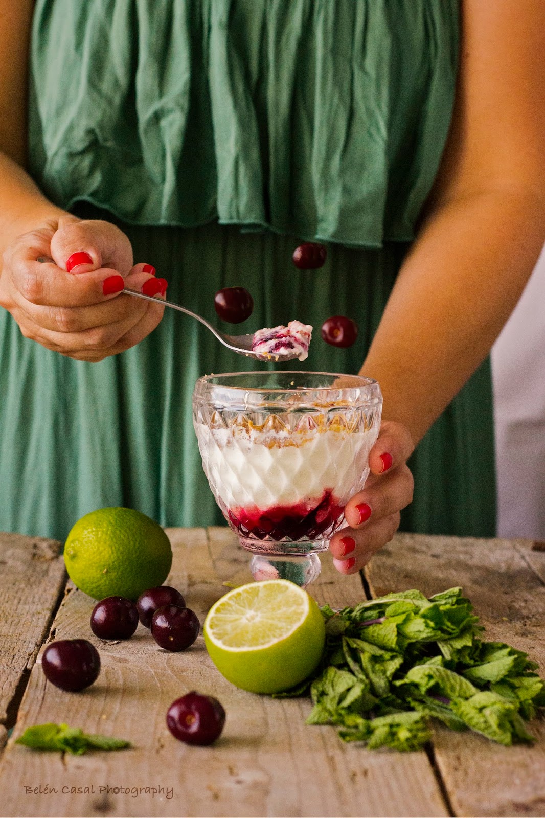 En verdad el título de esta entrada debería ser algo más largo para describir exactamente de qué va la receta de hoy. Algo parecido a "mousse de ricotta y lima con mermelada de cerezas casera y crumble de canela".